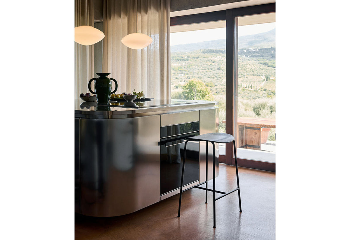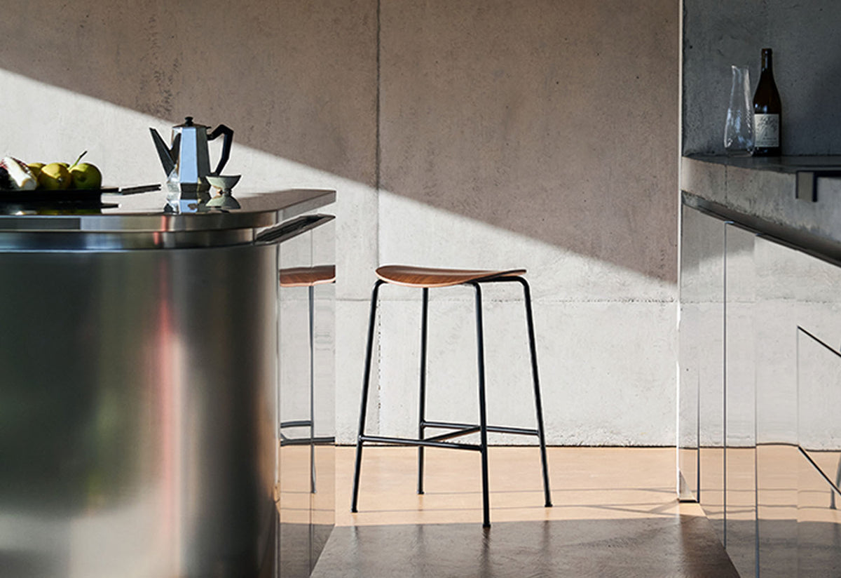 The Pavilion Bar and Counter Stools joined the collection in 2025, featuring a form-pressed seat, fluid curves and a barely-there silhouette. The seats are ideal for furnishing a bar or a kitchen, filling the space without making it appear too crowded.