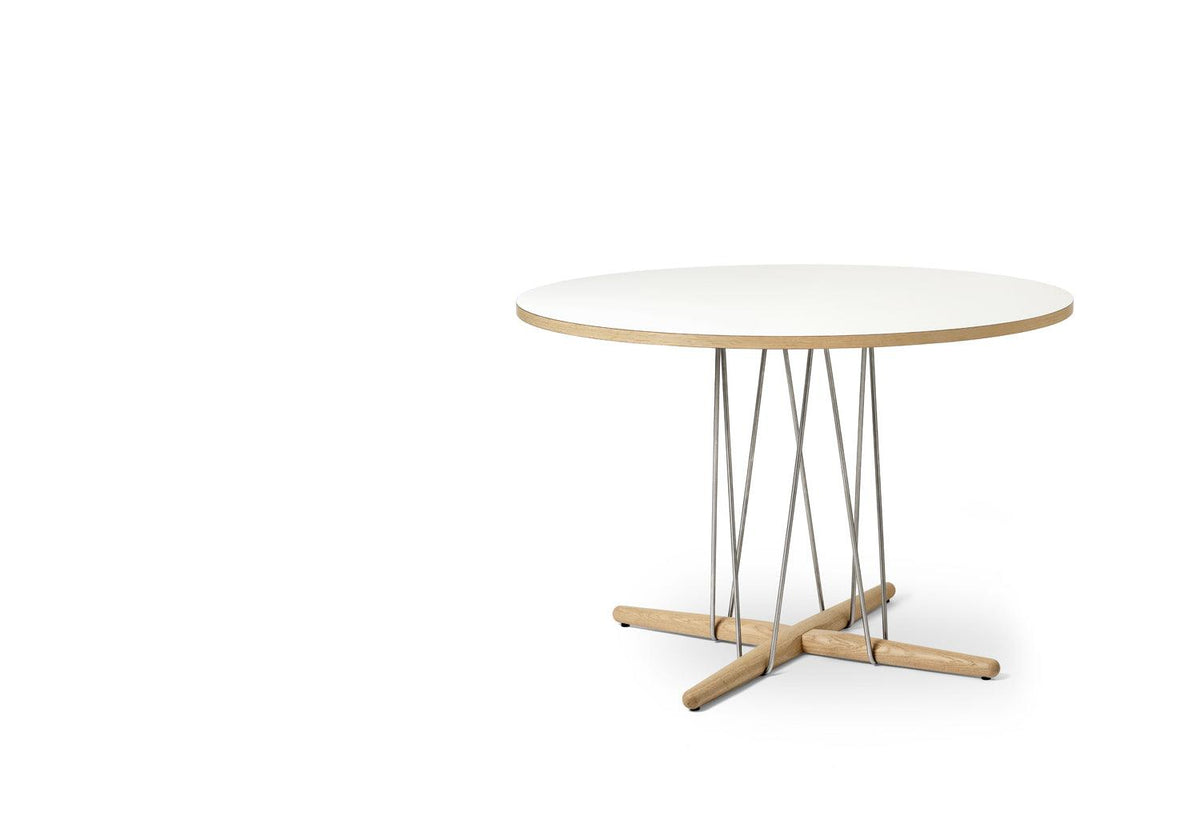 Crafted from three components, the design has a wooden base, a steel wire structure and a round tabletop.
