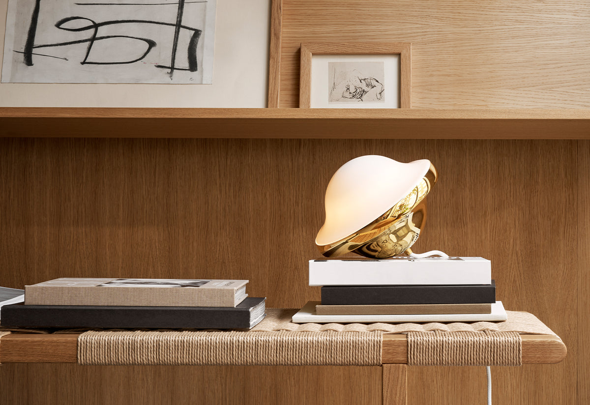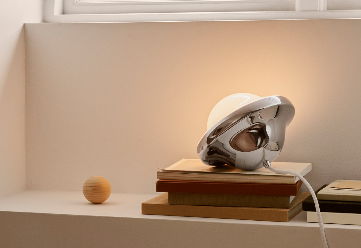 Inspired by Koppel's grandchild's summer hat, the HK20 Bubi Lamp features an organic, drop-like shape, combining a chrome or brass-plated steel socket with an opal acrylic shade. This versatile lamp provides soft, diffused light to illuminate small areas and can be hung from the ceiling or placed on a surface directly on its casing.