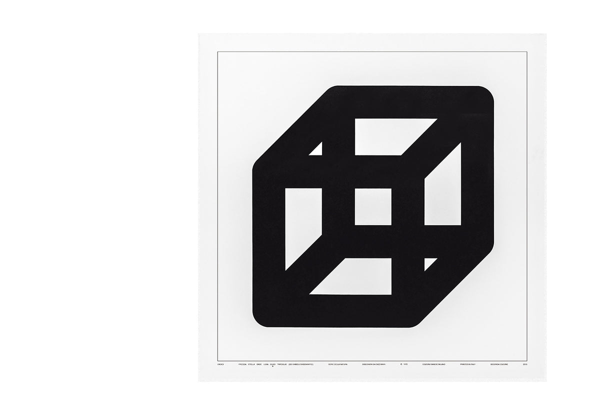 The Undici, Cubo screen print is part of Enzo Mari's monochromatic Synsemantic Symbols series from 1972. The motivation behind the series was to bring art into the home through making it accessible to all.