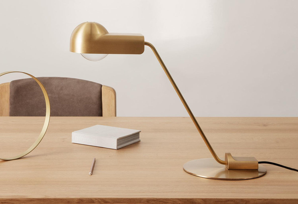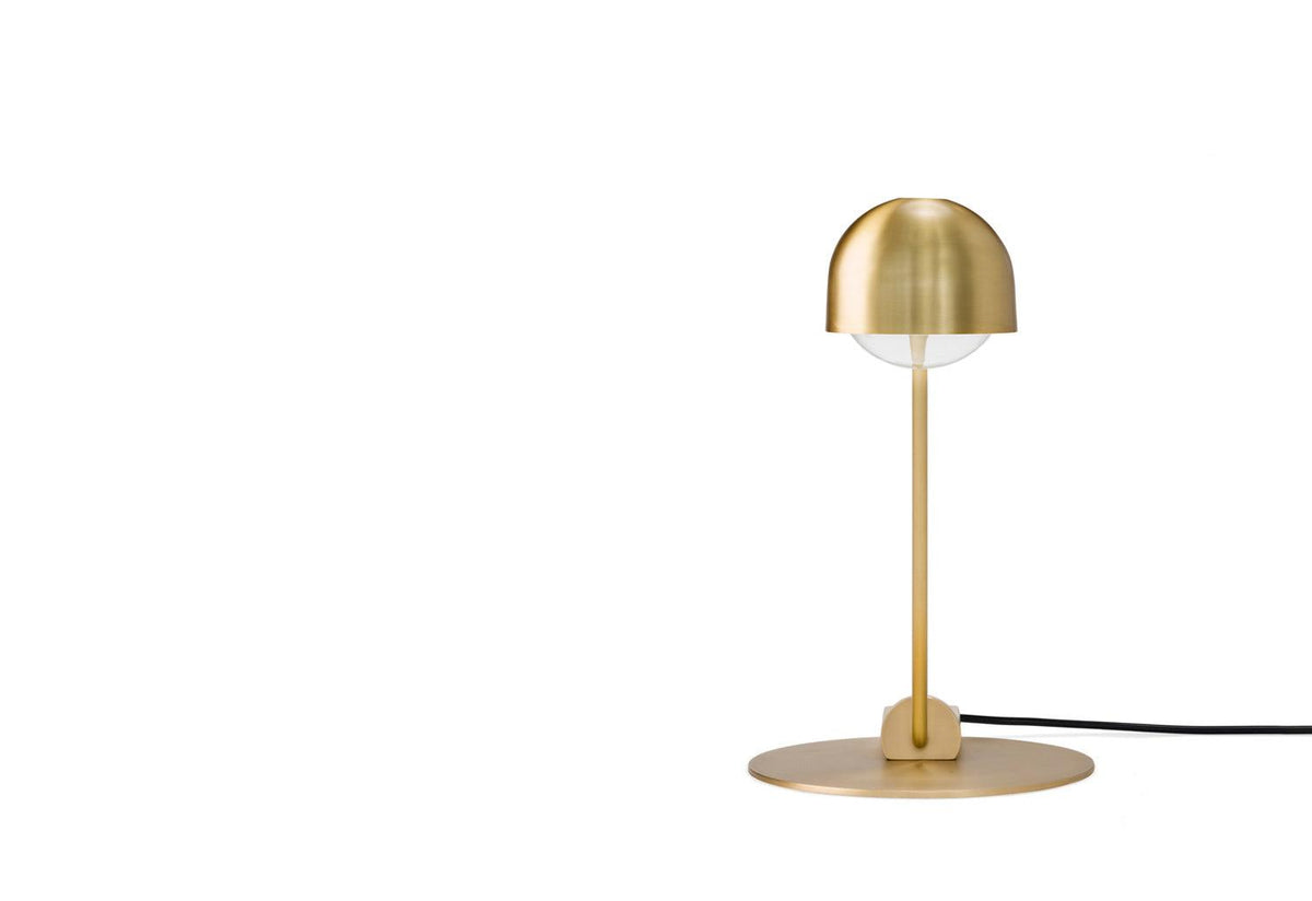 Available in powder coated black or clear lacquered brushed brass finish. A steel rod and base support the aluminium shade.