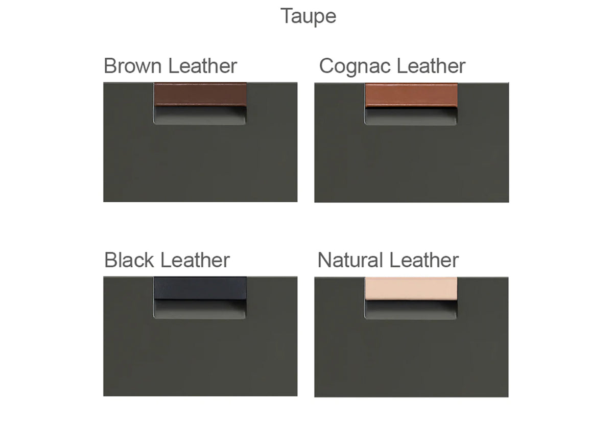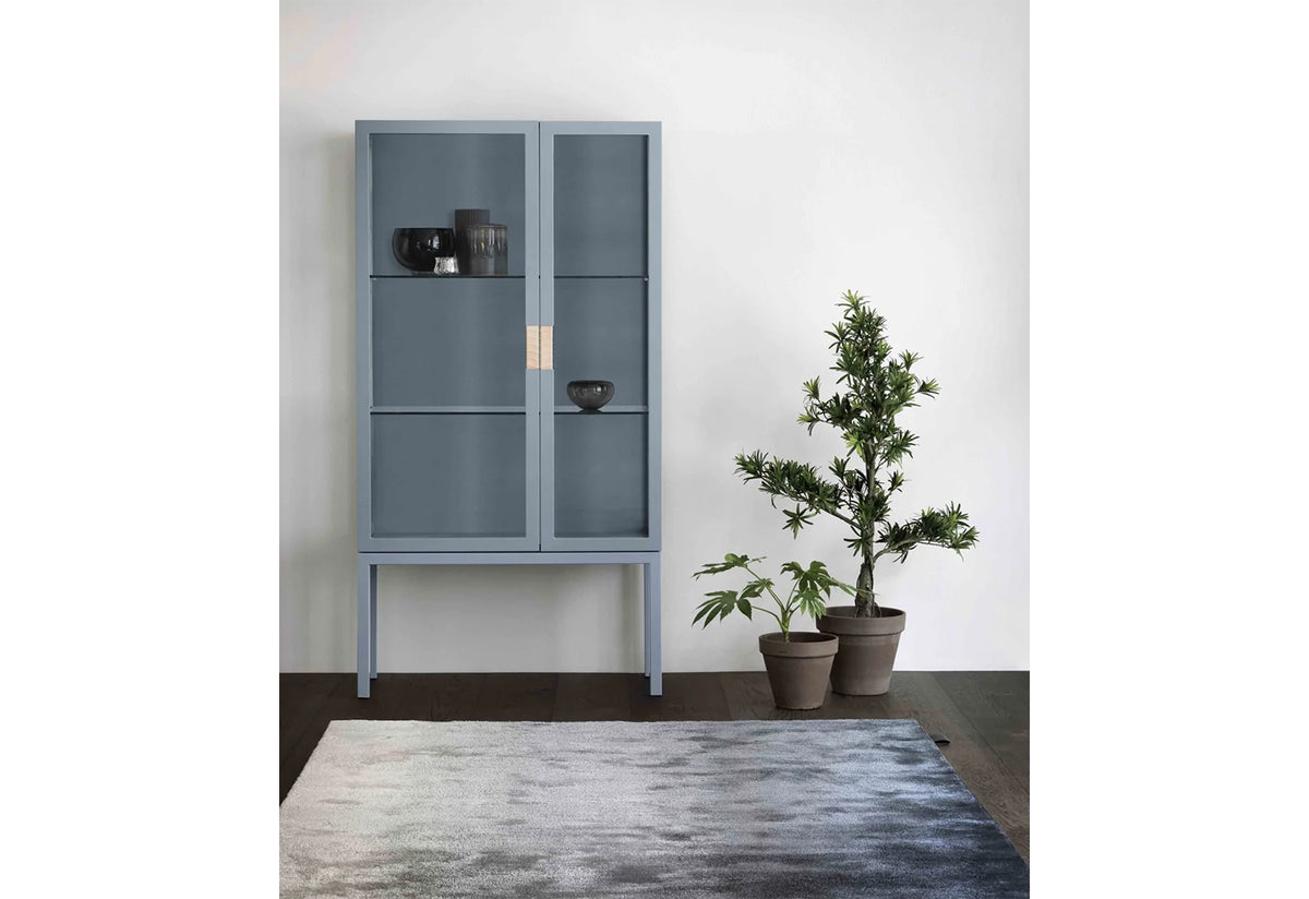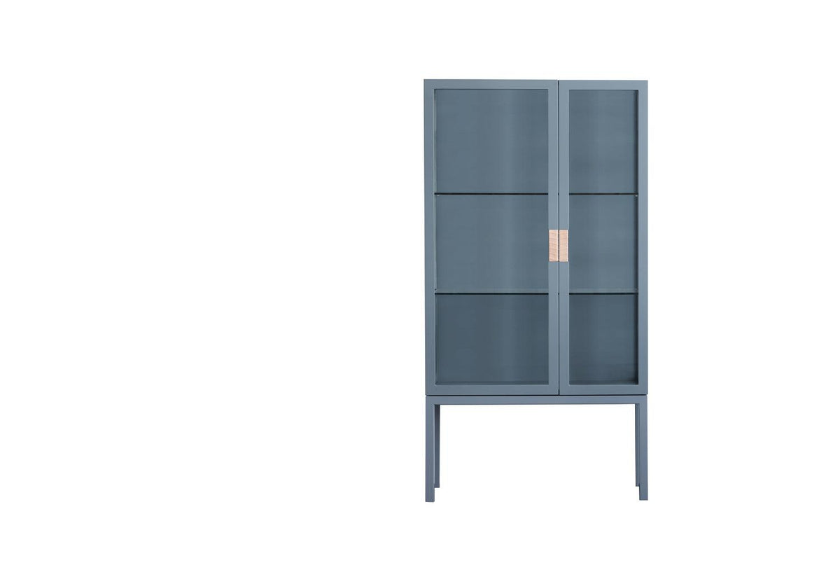 Glass cabinet in lacquered MDF with a lacquered metal stand and twined natural leather handles. Available in char grey, dark sand, deep blue, green khaki, nordic blue, storm grey, taupe, and white. Handles in twined natural, cognac, dark brown, or black leather.