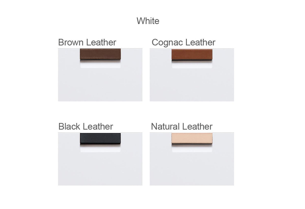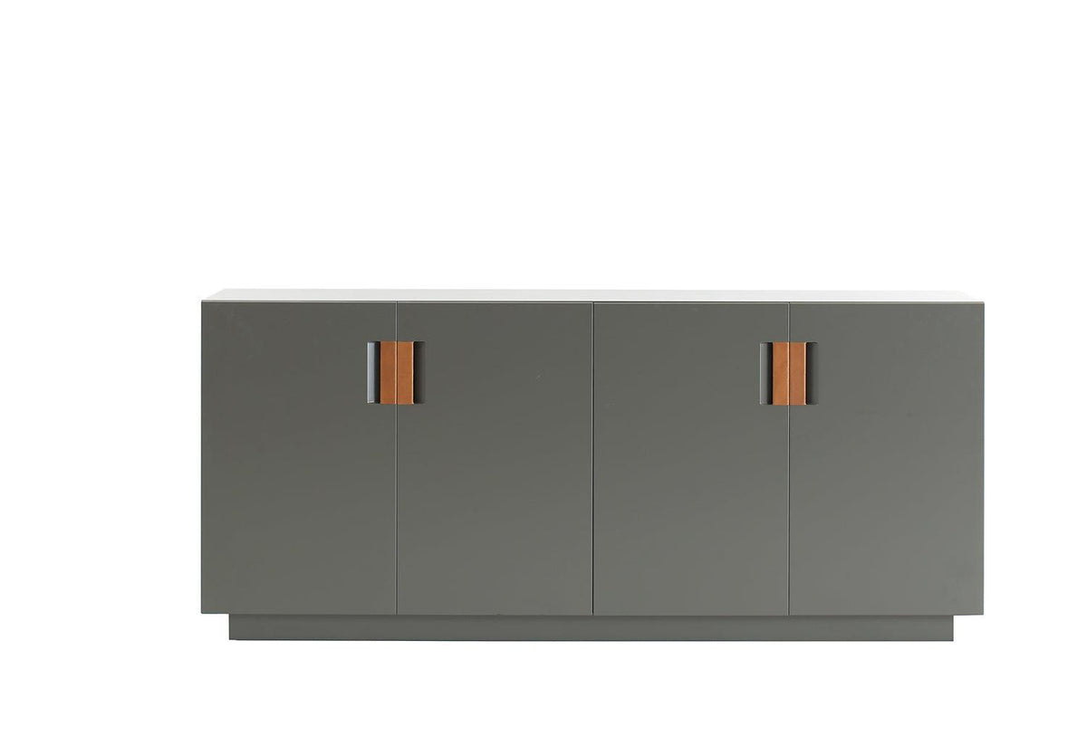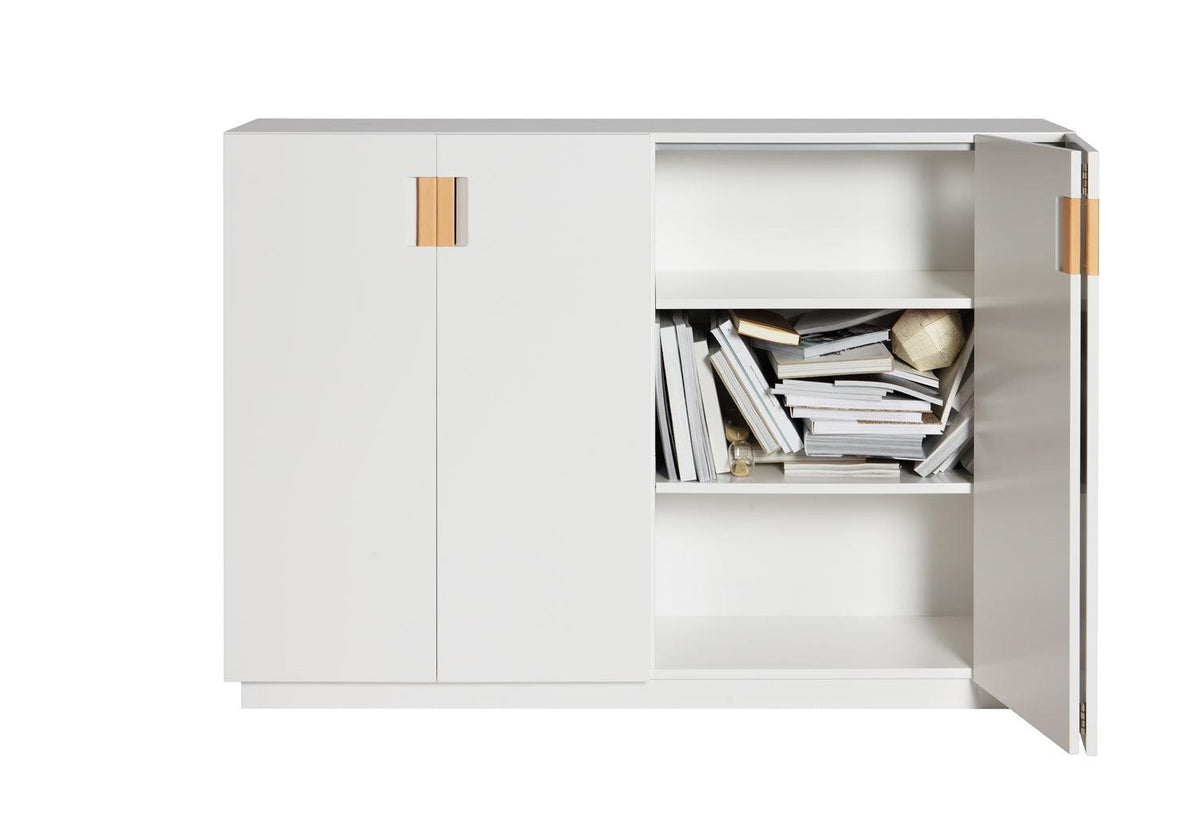 Features sliding doors, lacquered shelves, x1 in Frame 160, and genuine leather handles. The cabinet is available in nine different lacquered MDF finishes.