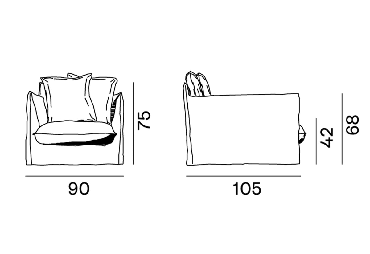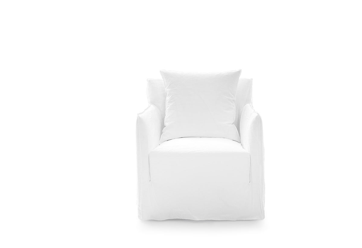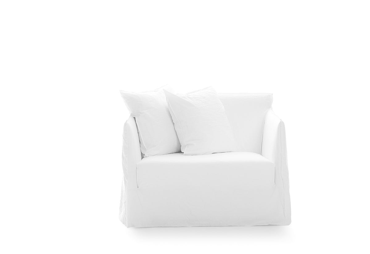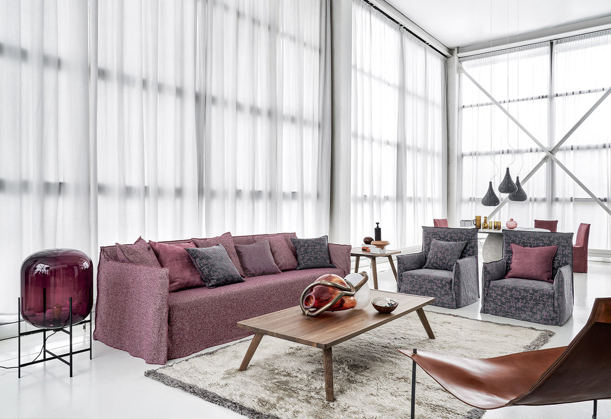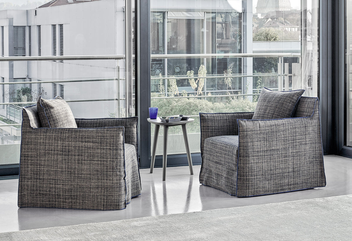 The Ghost family armchairs offer a range of backrest heights and seat sizes, boasting a sleek and minimalist design complemented by polyurethane foam padding and loose cushions filled with a combination of down and synthetic fibers.