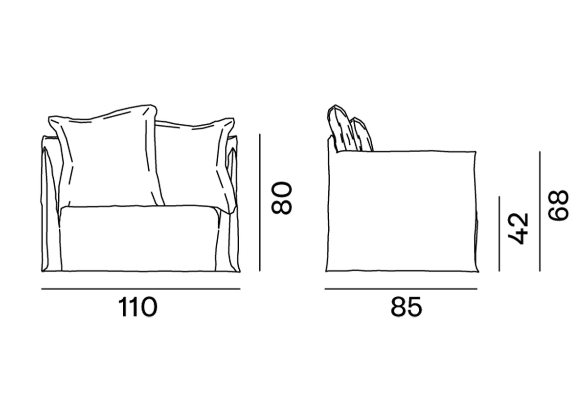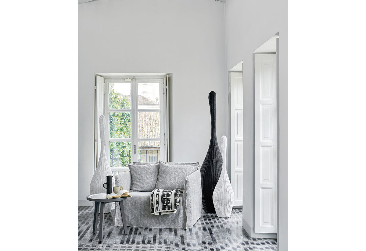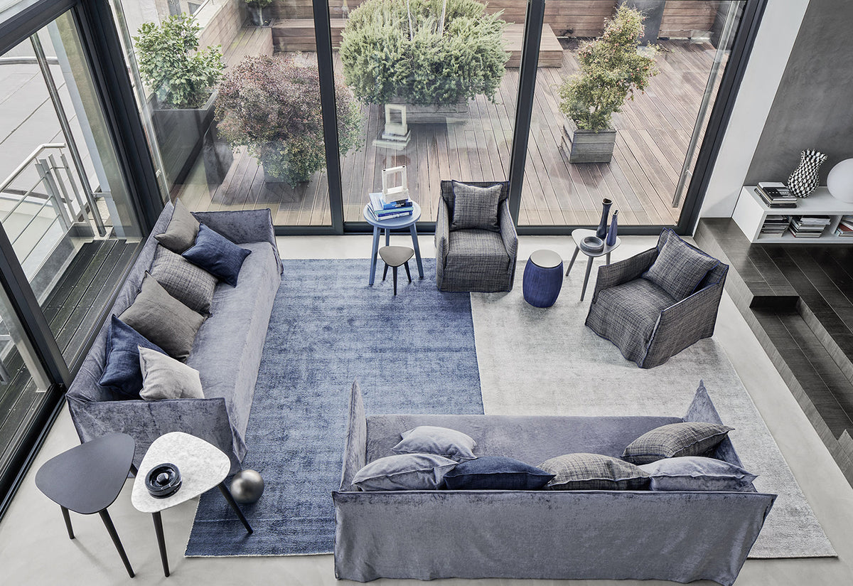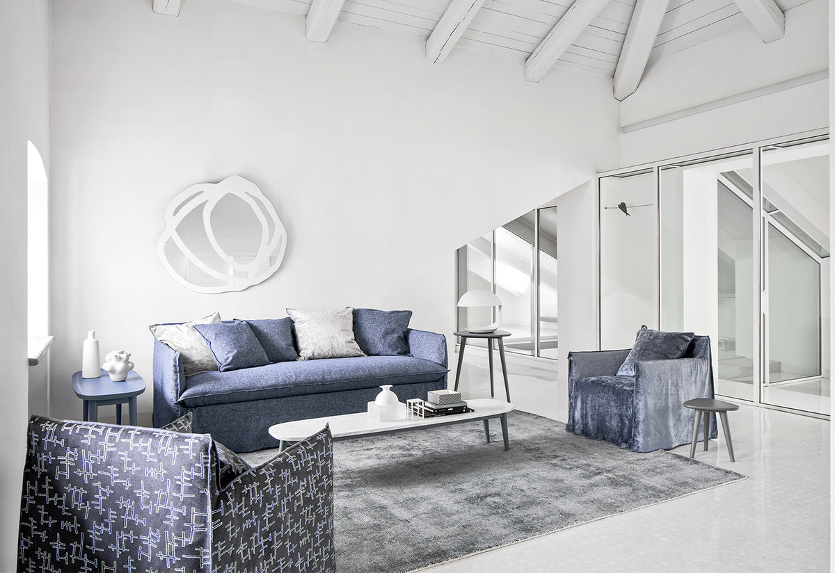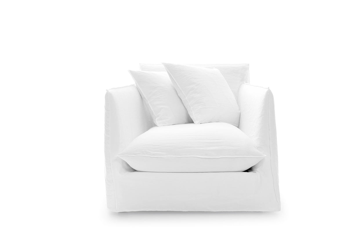 The Ghost family armchairs offer a range of backrest heights and seat sizes, boasting a sleek and minimalist design complemented by polyurethane foam padding and loose cushions filled with a combination of down and synthetic fibers.