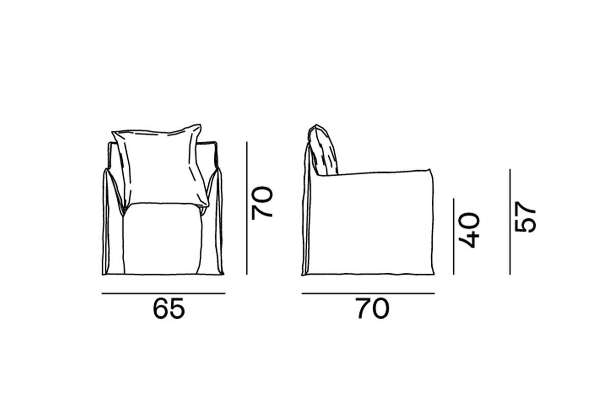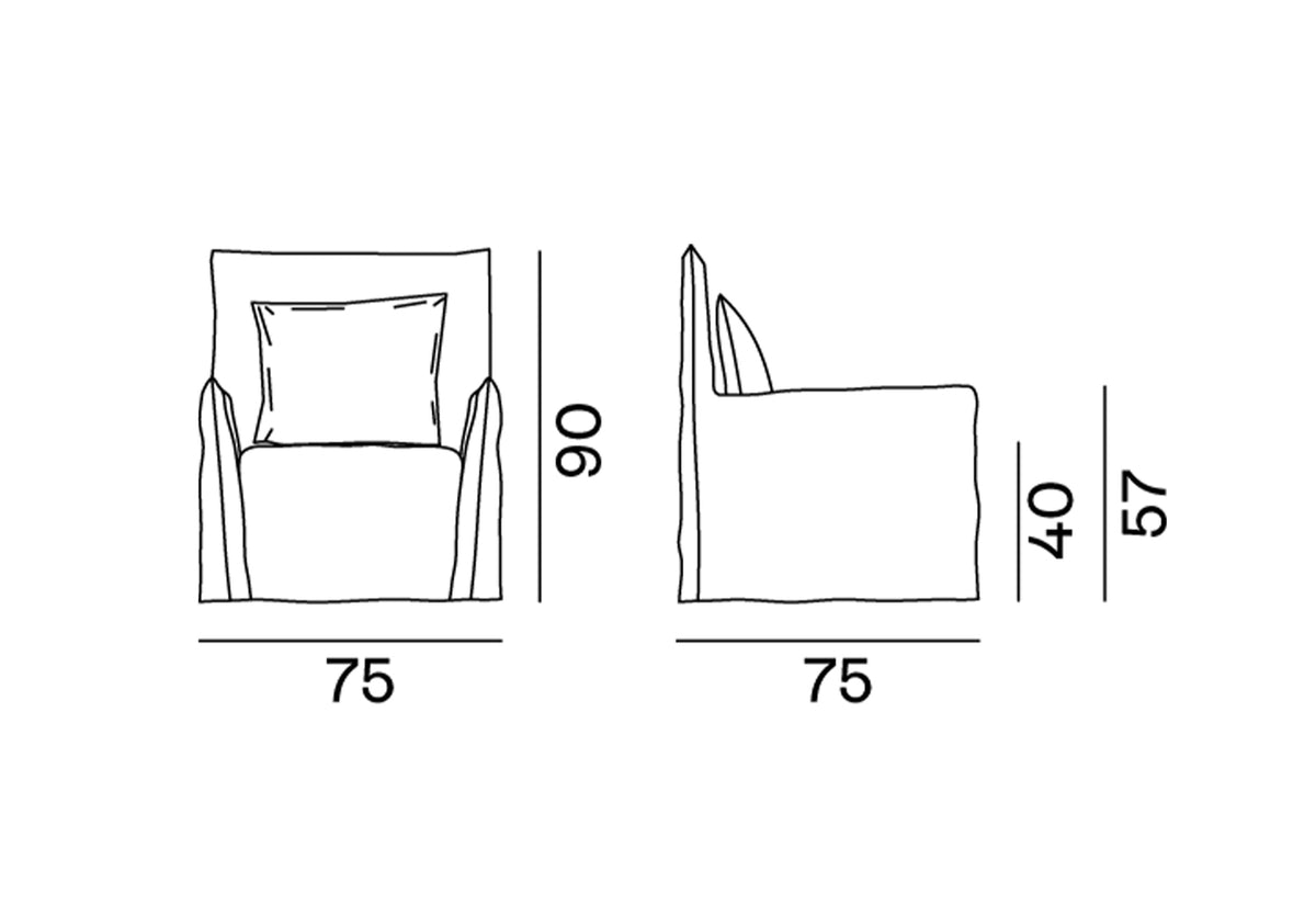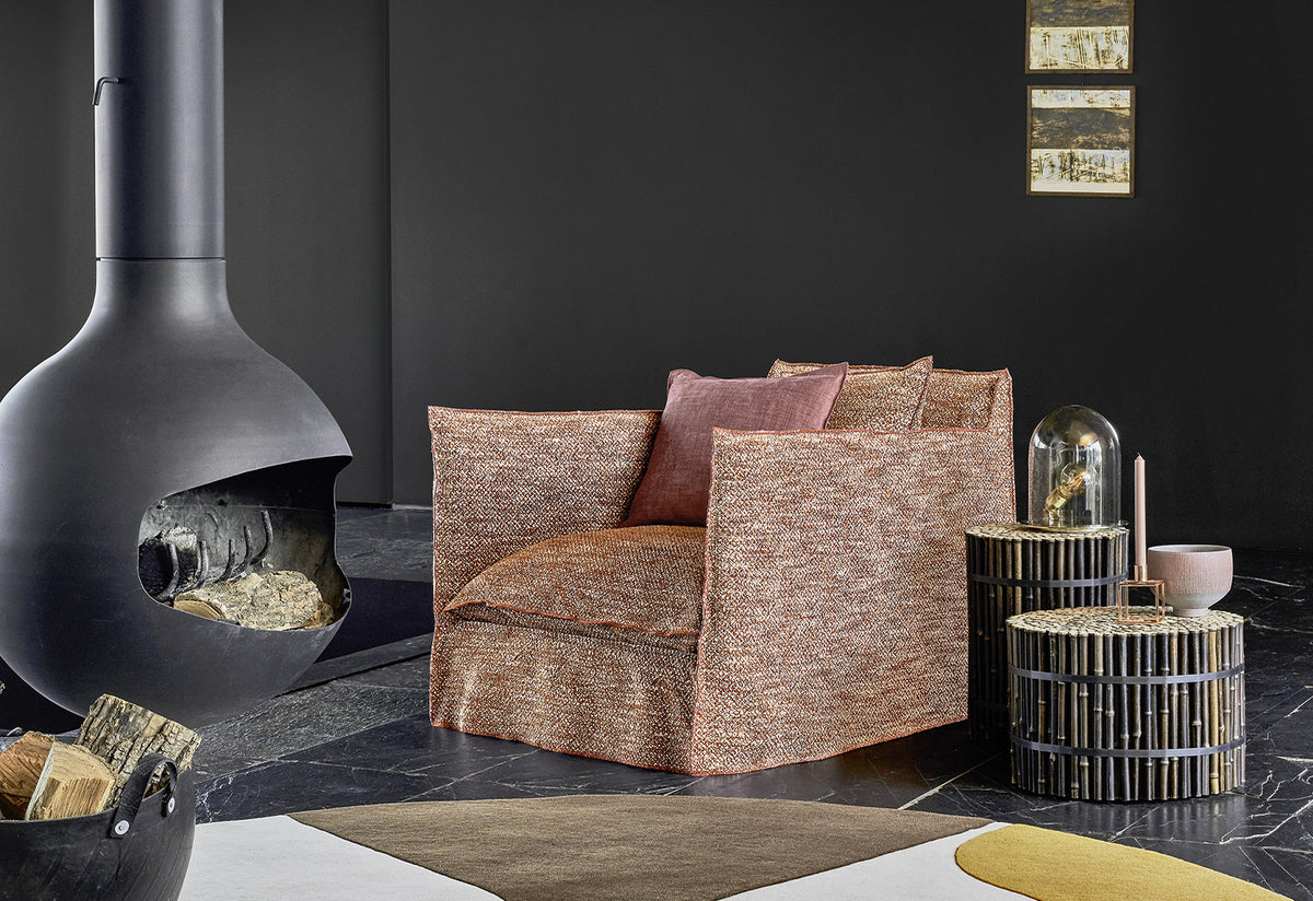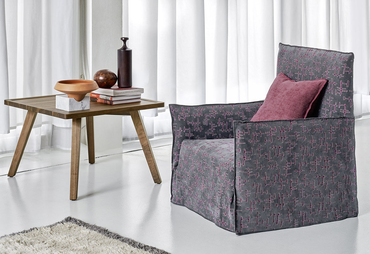 One standout feature of these armchairs is the removable cover—a generously proportioned sleeve accentuated by visible stitching, enabling effortless attachment and removal. This textile element facilitates swift and seamless transformations, effortlessly transitioning the chair's aesthetic from sophisticated elegance to a more relaxed and informal style.
