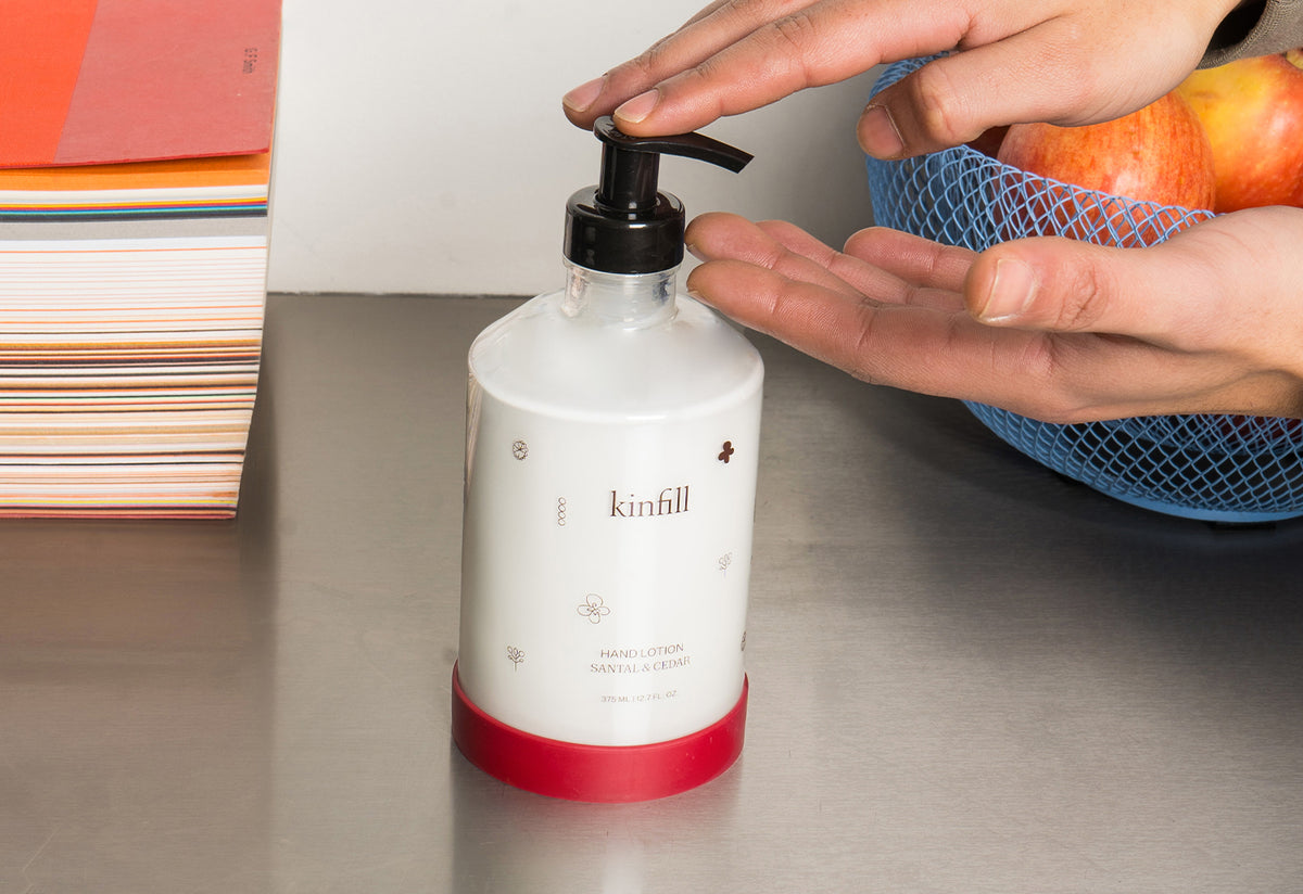 This hand lotion from Kinfill is infused with ginseng, chia and shea butter, providing deep hydration and protection while refreshing and energizing the skin. The lotion features a warm sandalwood and cedar base scent complimented by crisp, fruity undertones.