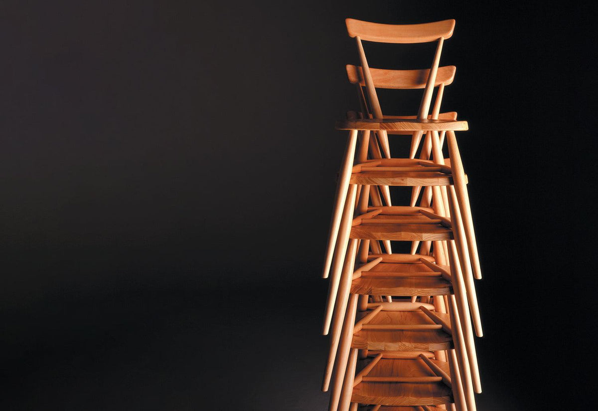 This 1957 chair was cleverly designed to stack vertically. The original was widely used by meeting rooms and schools, before the dawn of the ubiquitous polypropylene chair. Now it forms an ideal chair for when you have extra visitors, whilst when not in use a stack of these chairs makes a dramatic display.