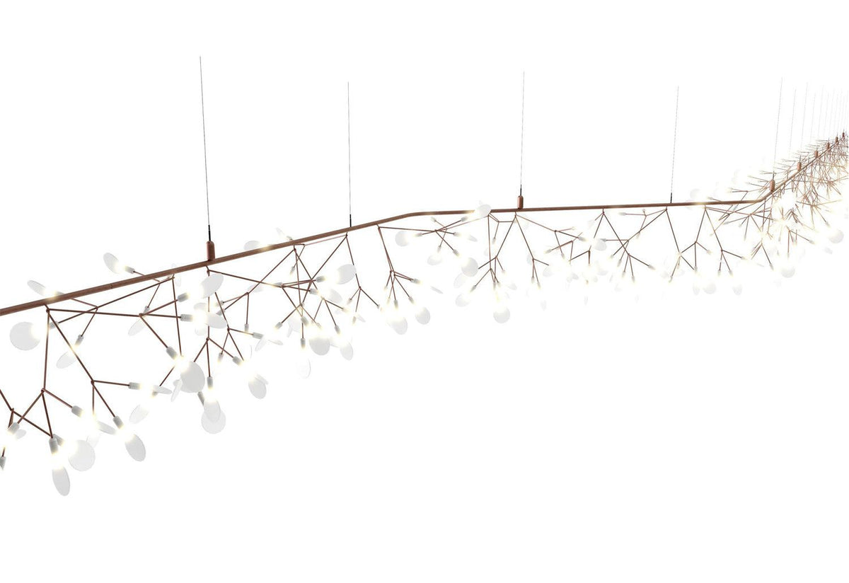 This decorative LED lamp from Moooi designed in 2014 is inspired by the Heracleum Plant. The Heracleum Endless pendant light is a perpetual blossom of new branches that can be added to by the meter. The possibilities are almost limitless by combining straight lines, angles and corners.