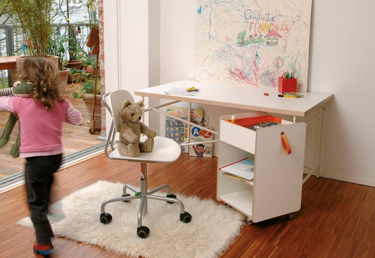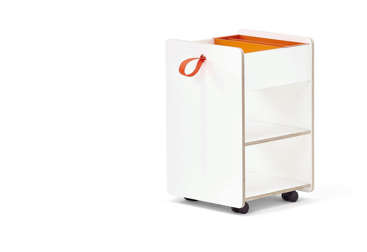 Part of the Eiermann desk range for children. The unit is available with an optional pen tray in orange steel. The Fixx pedestal unit is a perfect storage solution for children, featuring 4 wheels for easy movement.