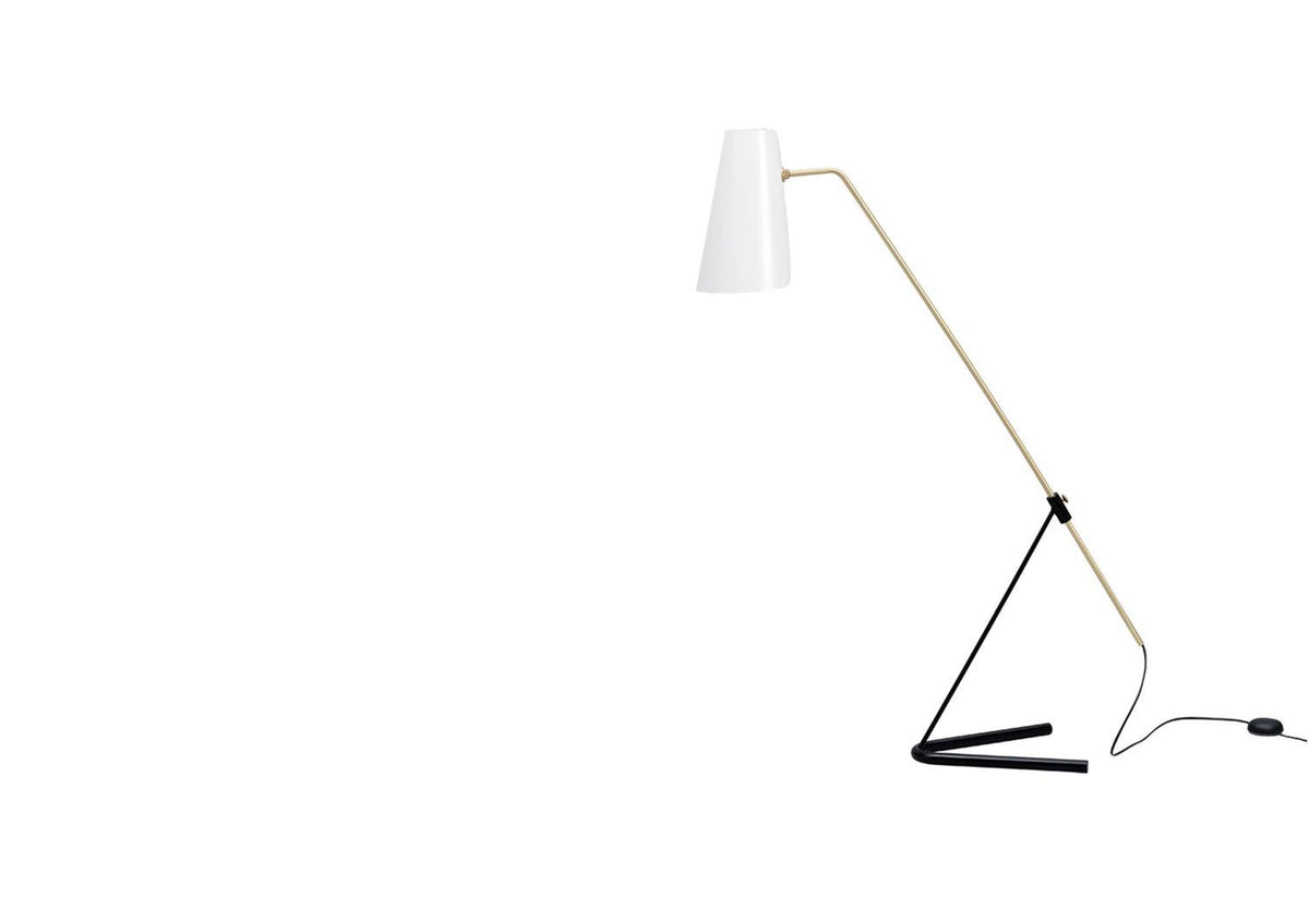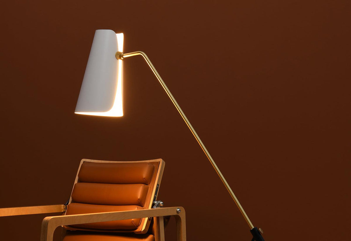 The G21 floor light has a metal shade in white or black, always with a white interior. A brushed and lacquered brass rod makes it possible to adjust the height of the floor light.