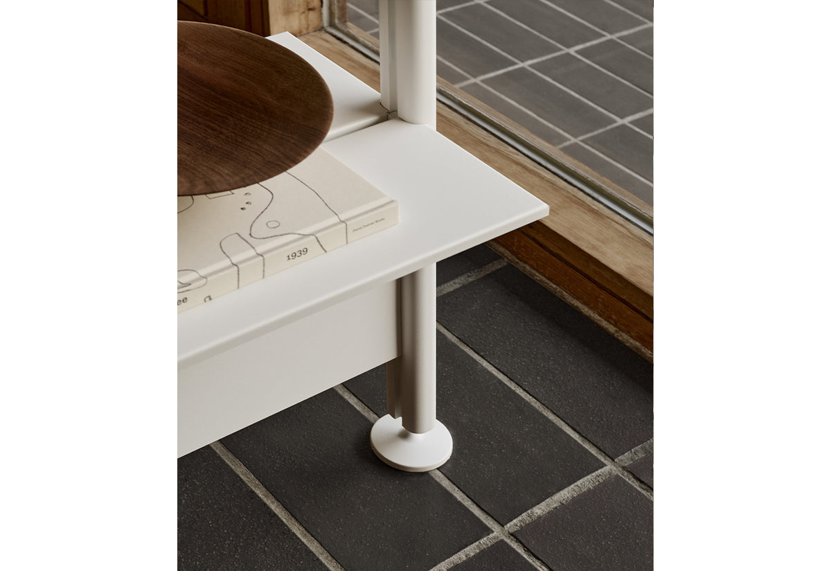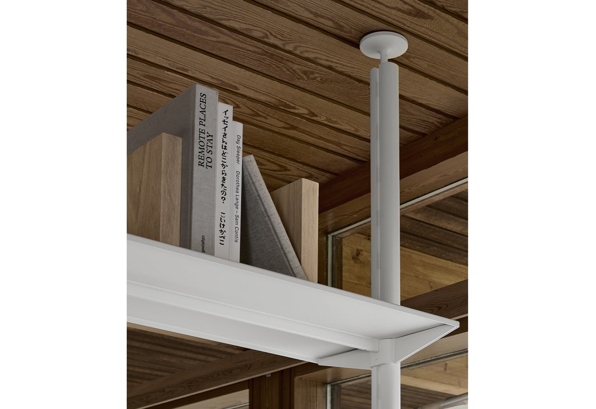Central to the Pira G2's design is its pole, which enables an independently standing floor-to-ceiling tensioned shelf system. The shelves seamlessly intertwine with the poles, creating a unified structure within the modular system and a functional and striking visual presence.