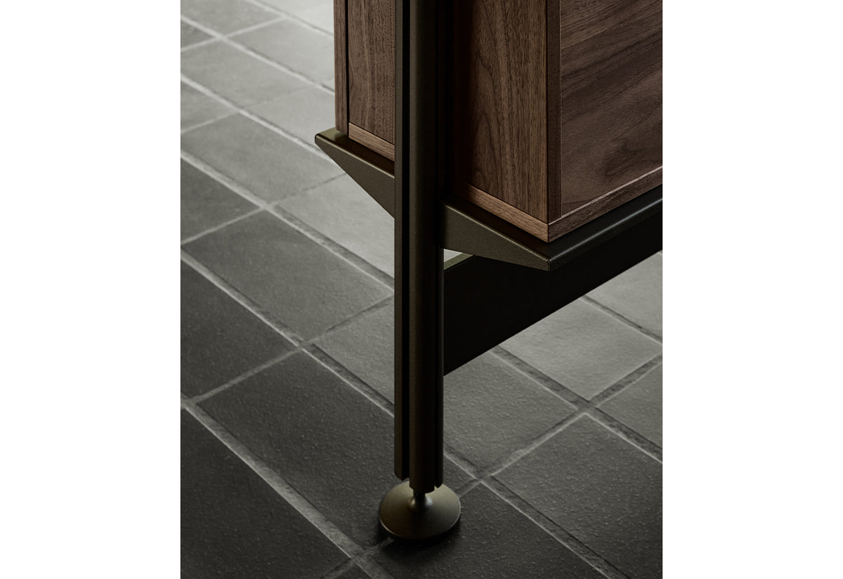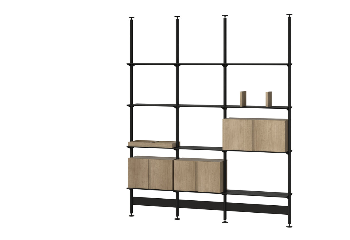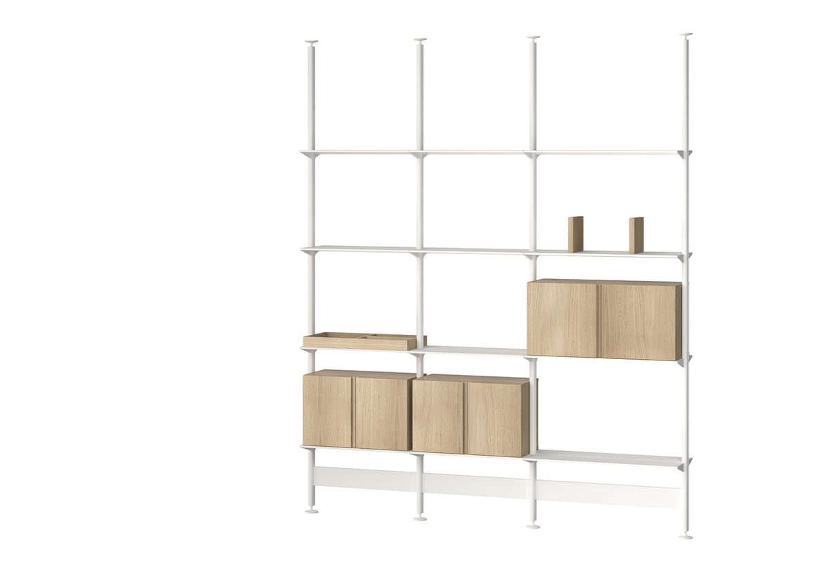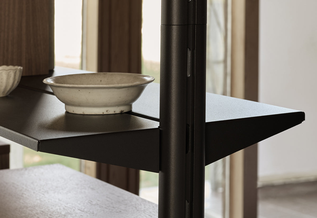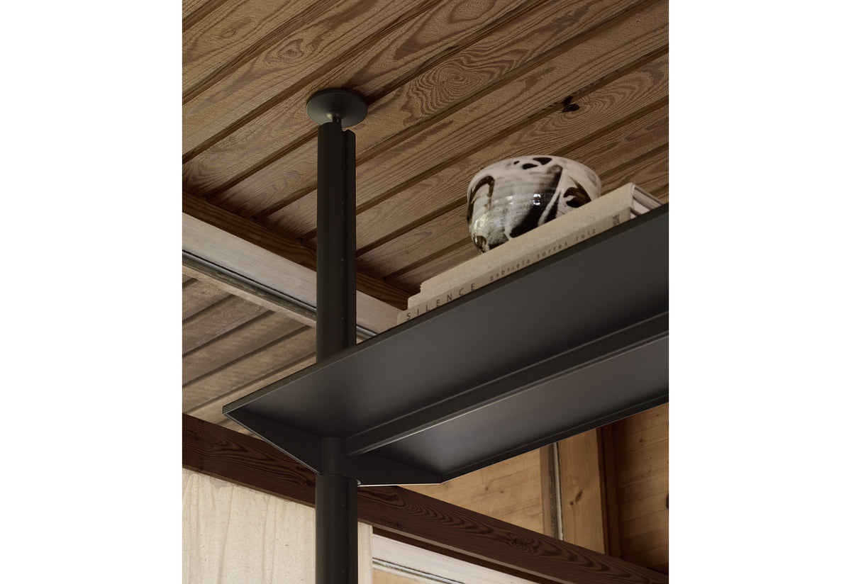 Central to the Pira G2's structure is its pole, which facilitates its ability to stand freely through a floor-to-ceiling tensioned shelf system. The shelves seamlessly intertwine with the poles, creating a unified structure within the modular system and a functional and striking visual presence.