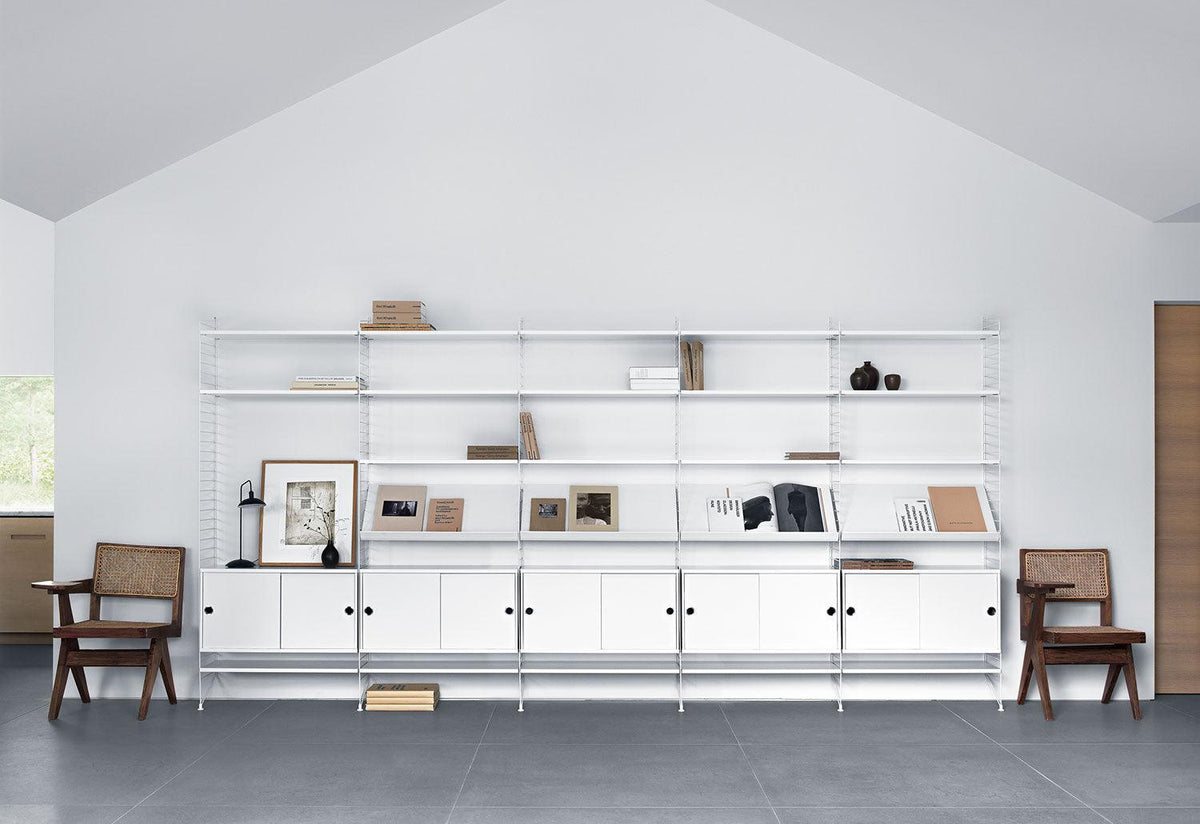 The String System is a robust and versatile shelving system offering different shelves depths, which can be combined and enriched with separate filing or display cabinets, magazine racks, table, drawers, desk, etc. modules.