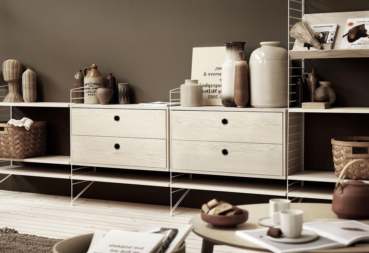 The String System is a robust and versatile shelving system offering different shelves depths, which can be combined and enriched with separate filing or display cabinets, magazine racks, table, drawers, desk, etc. modules.