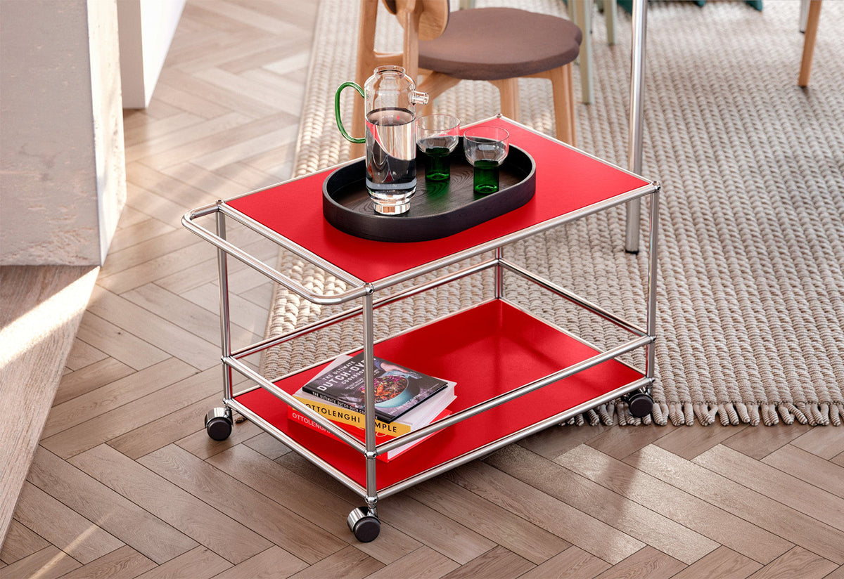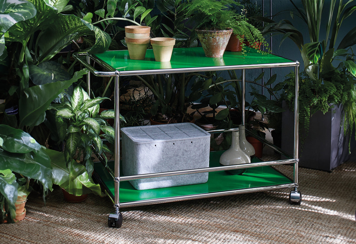 Introducing the USM Haller L serving trolley, a perfect blend of aesthetics and remarkable functionality. The serving trolley is ideal for serving beverages and showcasing glassware.